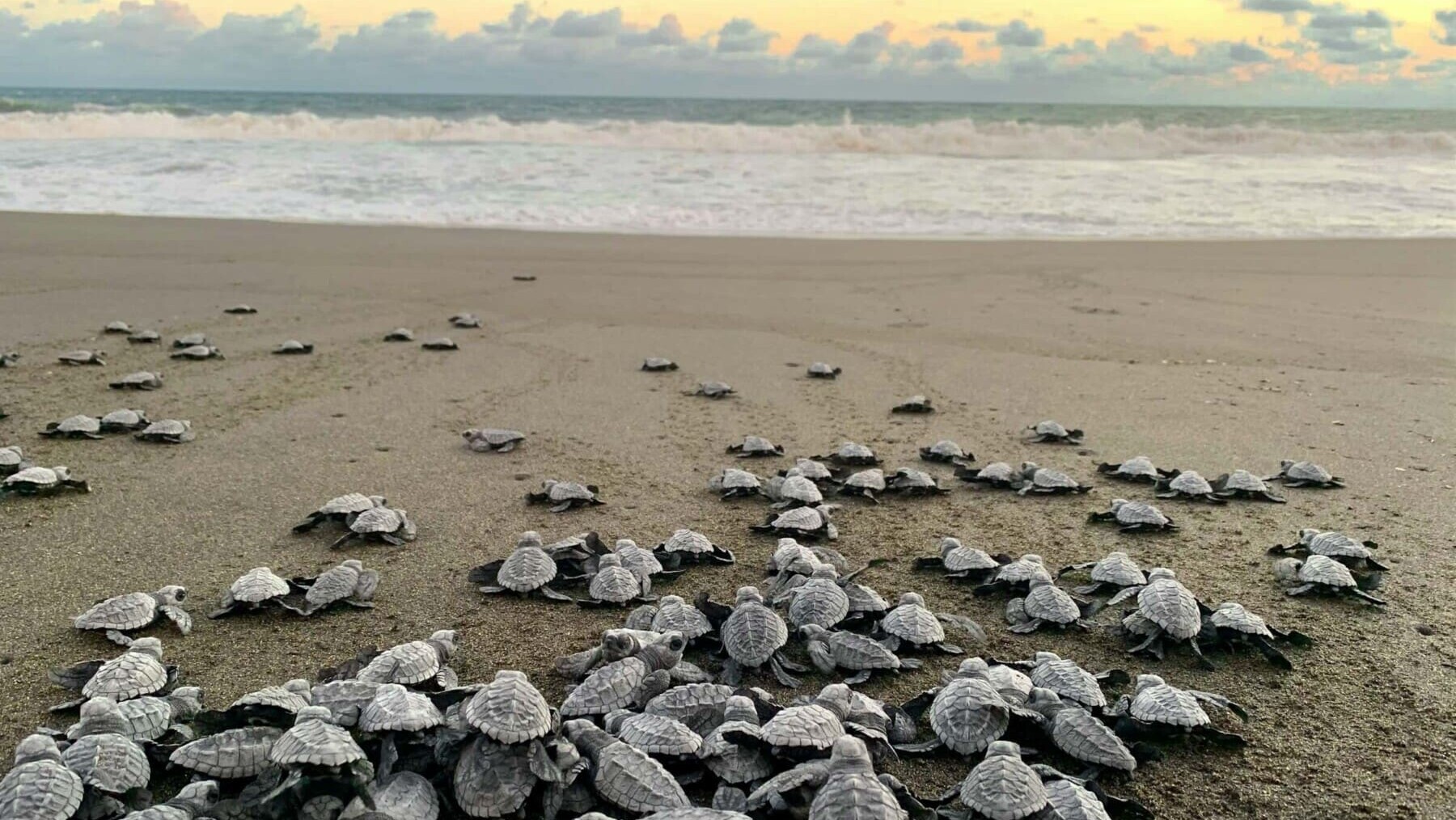 Hatchlings are more common later in the season because nests incubate for roughly two months on average (timing varies by nest and conditions).